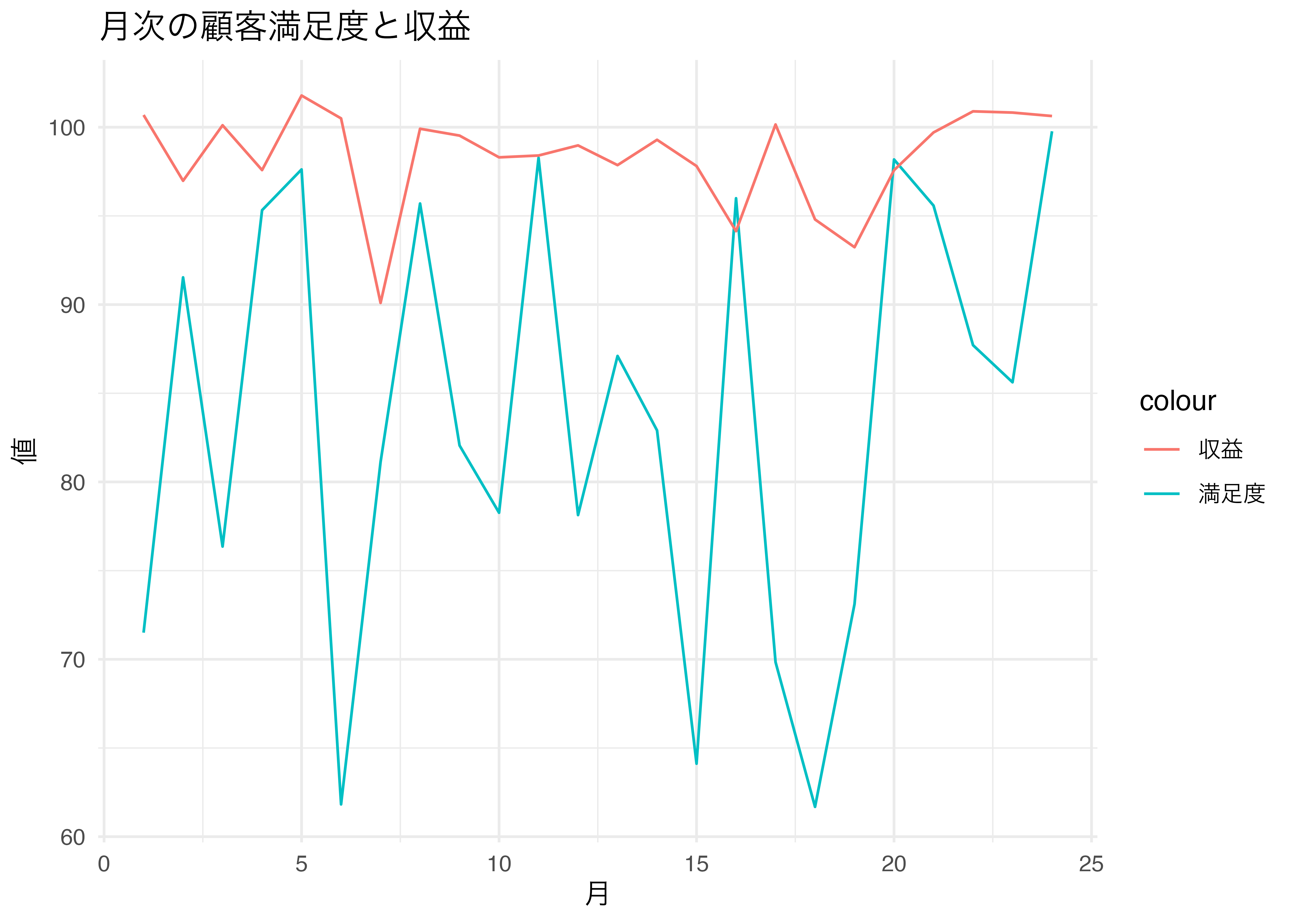 geom_line(aes(y = satisfaction, color = "満足度")) +