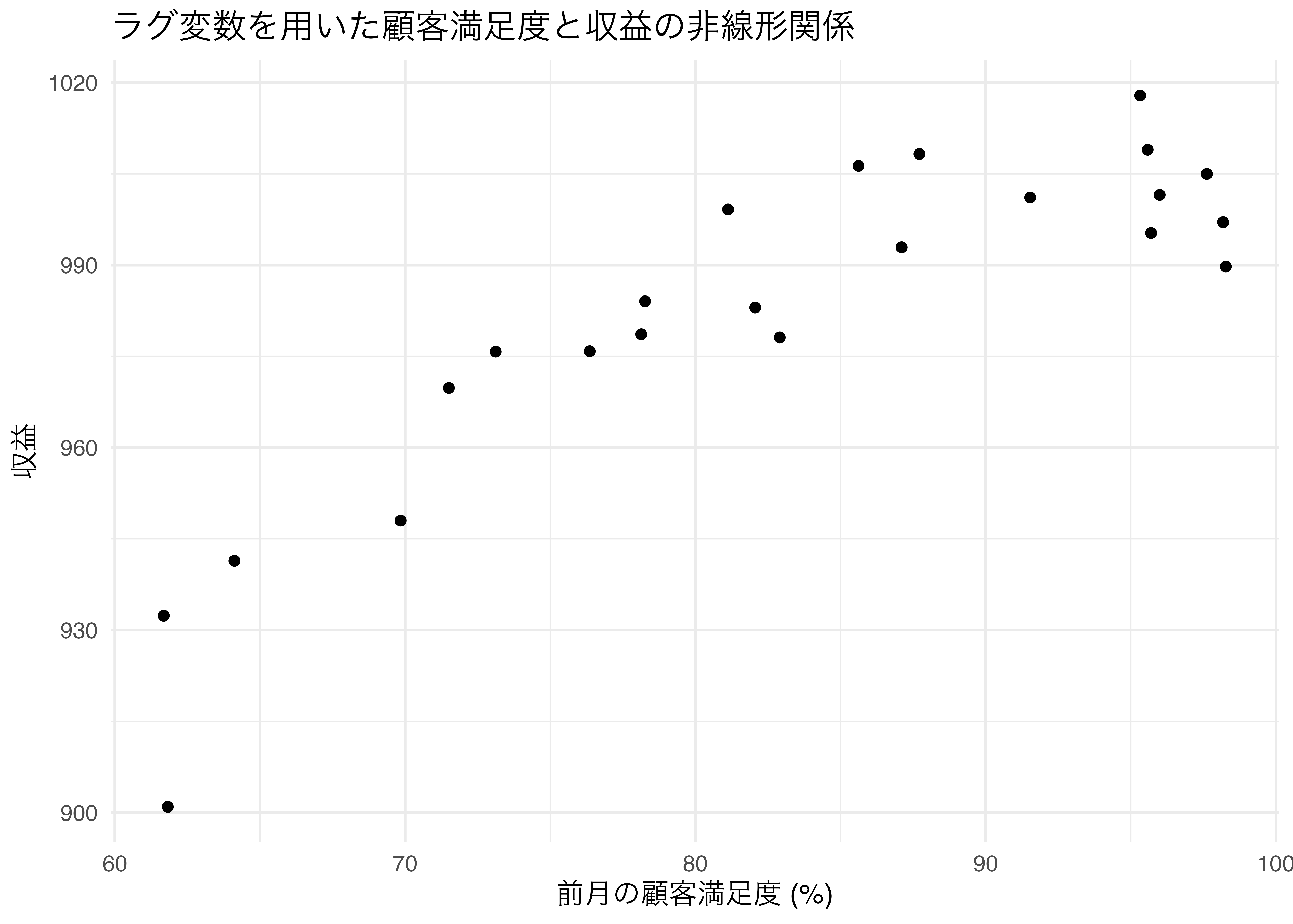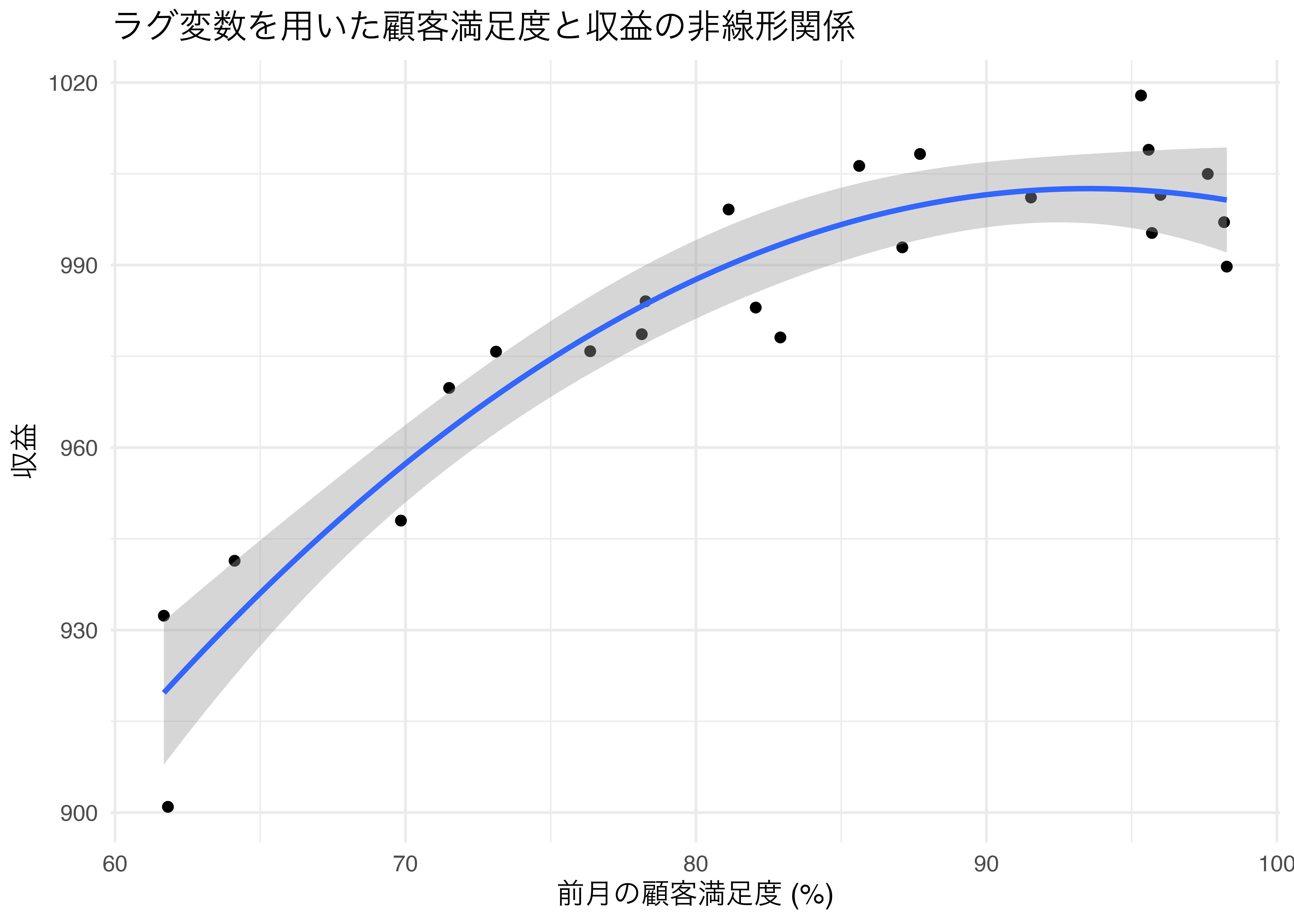 labs(title = "ラグ変数を用いた顧客満足度と収益の非線形関係",