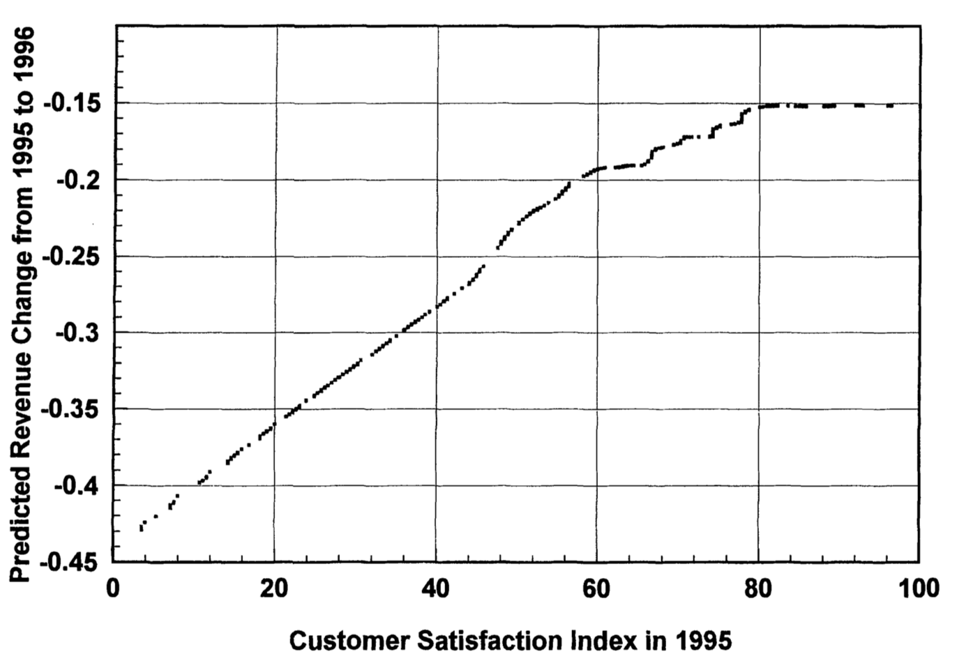 アメリカの通信会社の顧客満足データと財務データを使って,満足度と収益変化の非線形な関係を発見。