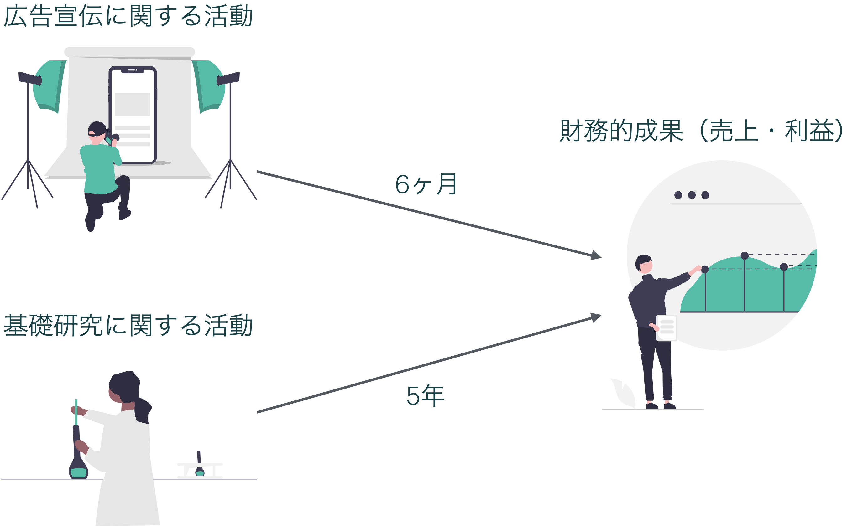 経営上重要だと思われるインプットとアウトプットの関係を分析する際,今回扱ったようなタイムラグもしくは非線形の関係を想定した方が良さそうだと考えられる例を,なぜそう考えたのか,という理由とともに一つ挙げてください。