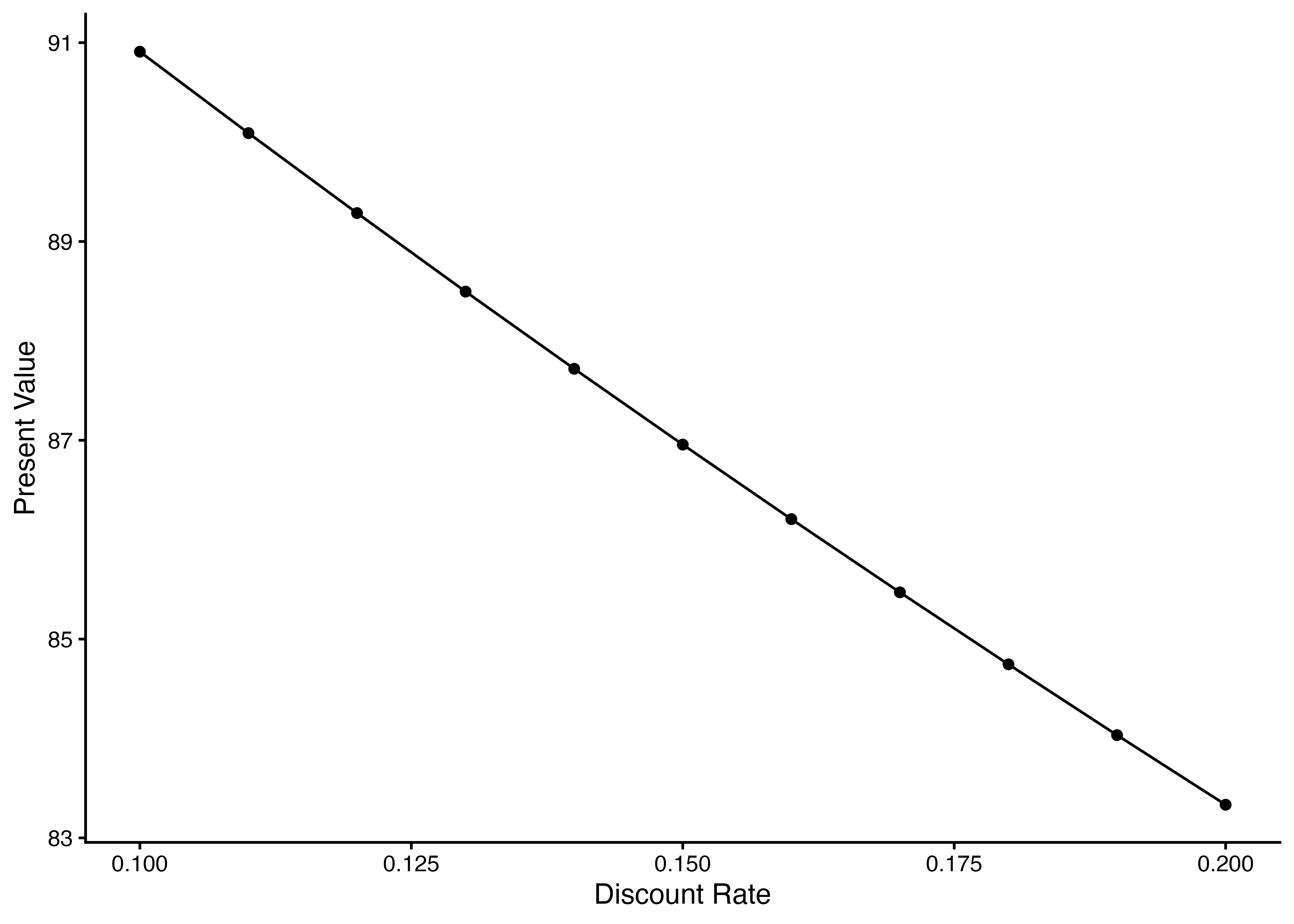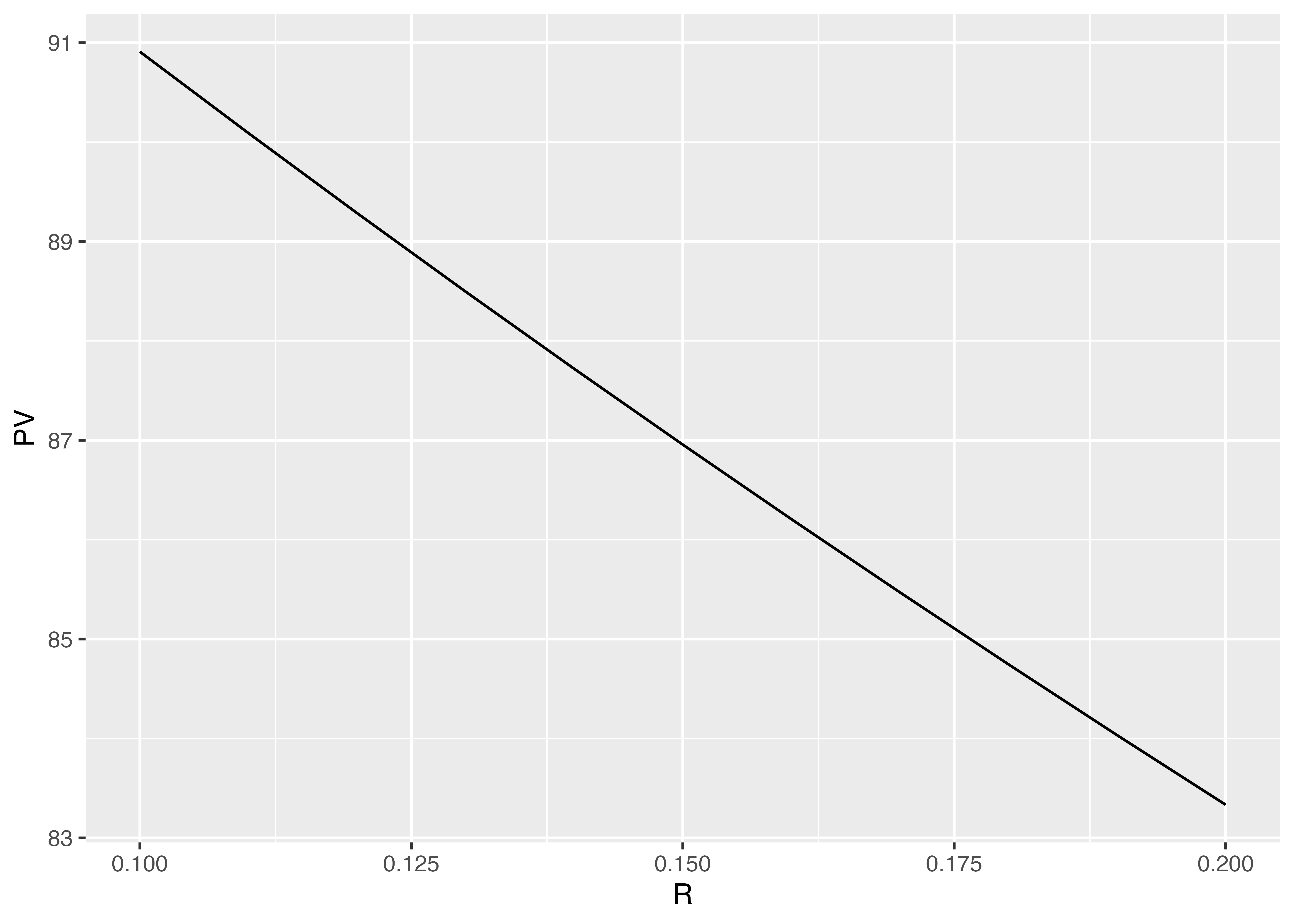 labs(x = "Discount Rate", y = "Present Value") + # labs()関数でラベル指定