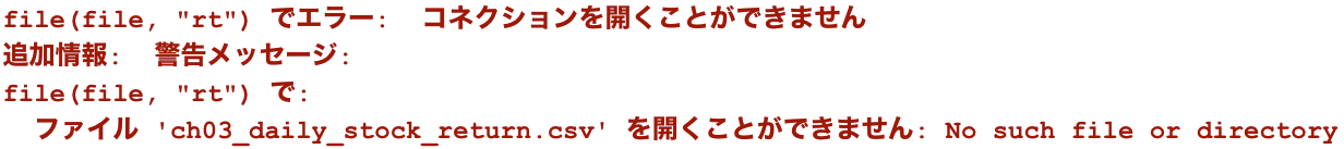- ファイルのパスとは,各ファイルのコンピュータ内部における住所のようなもので,相対パスと絶対パスの二種類が存在する.`ch03_daily_stock_return.csv`がコードと同じ作業ディレクトリに位置しているなら,上のように`"ch03_daily_stock_return.csv"`という相対パスのみ指定すれば,Rはそのファイルを発見できる.もし上のコードを実行して,次のようなエラーが出る場合,Rは`ch03_daily_stock_return.csv`を発見できていない.