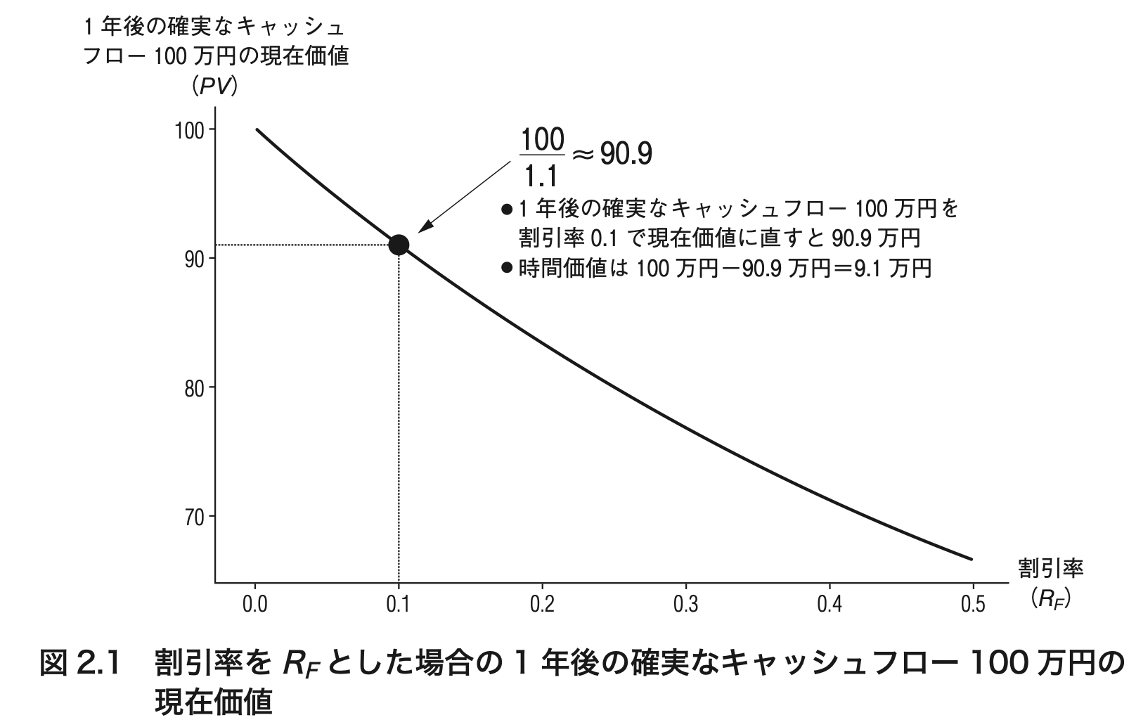 - 例として,確実に1年後に受け取れる100万円(すなわち,確実な1年後のキャッシュフロー100万円)の価値を現時点で評価してみよう.