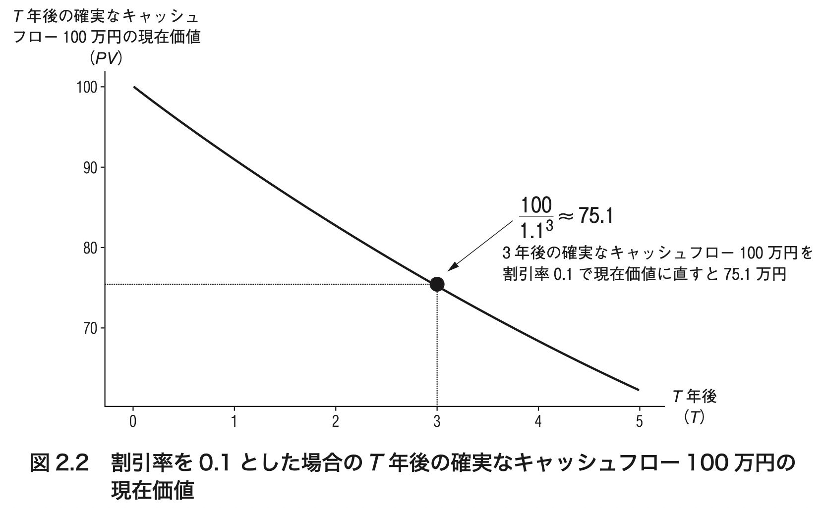 - この割引率は1年当たりの値であるので,仮に1年後ではなく$T$年後のキャッシュフローであれば[**その分だけ更に割り引く必要がある**]{style="color: red"}.